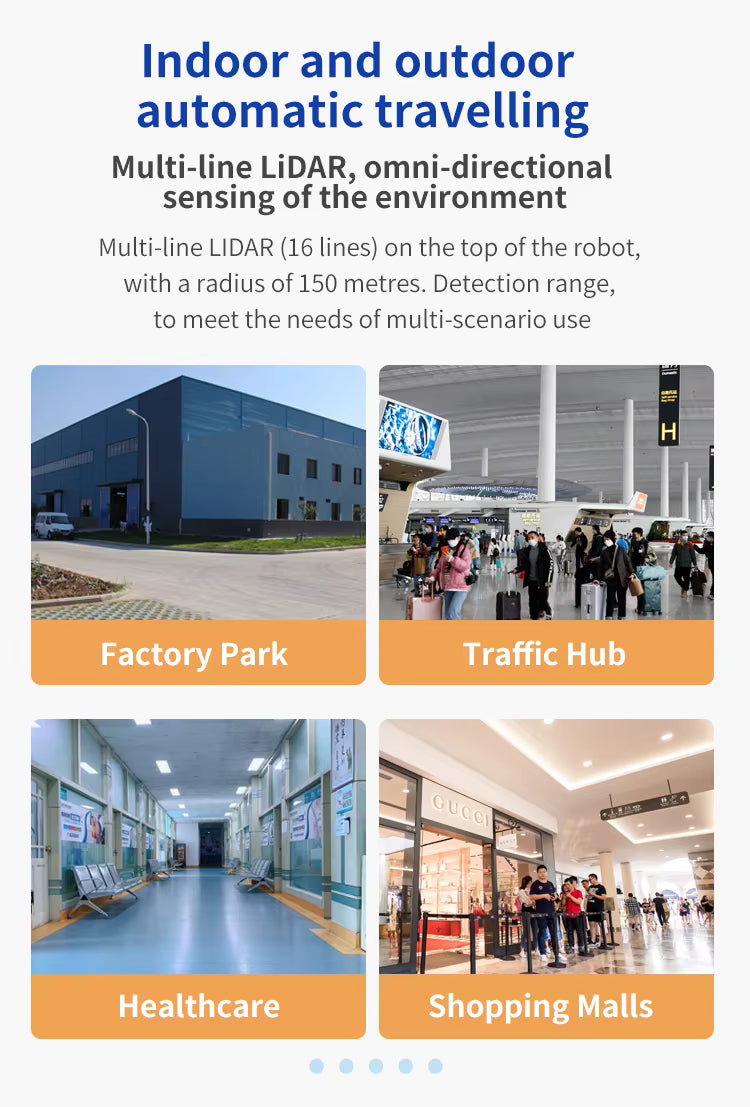 Ce châssis robotique industriel allie robustesse et intelligence pour des applications exigeantes telles que la logistique et la collecte de déchets. Avec une capacité de charge exceptionnelle et une autonomie prolongée, il fonctionne en toute autonomie grâce à son système de charge automatique.