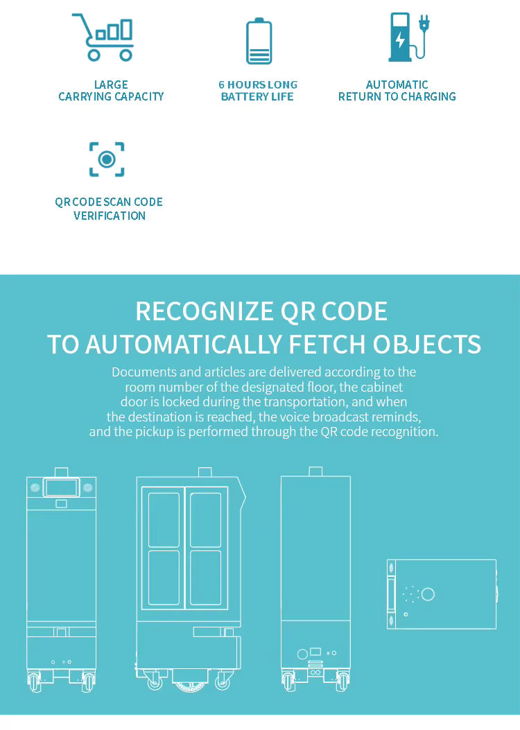 Ce robot de livraison autonome utilise la technologie Laser SLAM pour naviguer avec précision dans les espaces intérieurs. Il transporte jusqu'à 60 kg de boissons grâce à sa capacité de charge élevée et évite les obstacles en 0,5 s. Le système de contrôle d'ascenseur intégré permet un déploiement facile dans les établissements multi‑étages. La charge se fait automatiquement, garantissant une autonomie de 6 heures sans interruption.