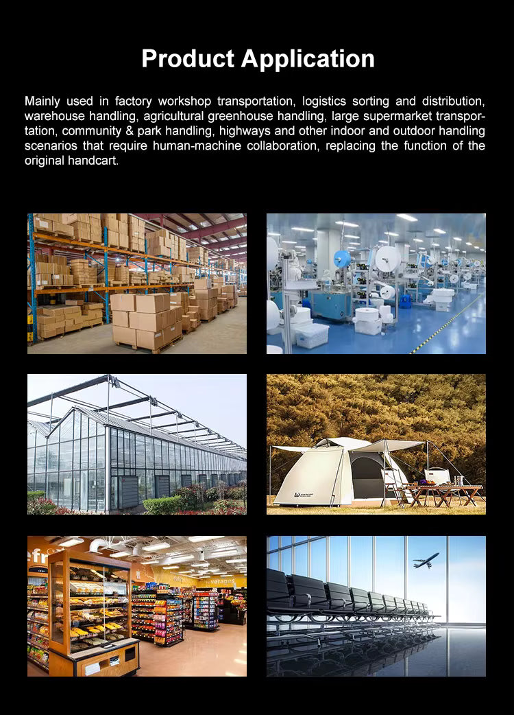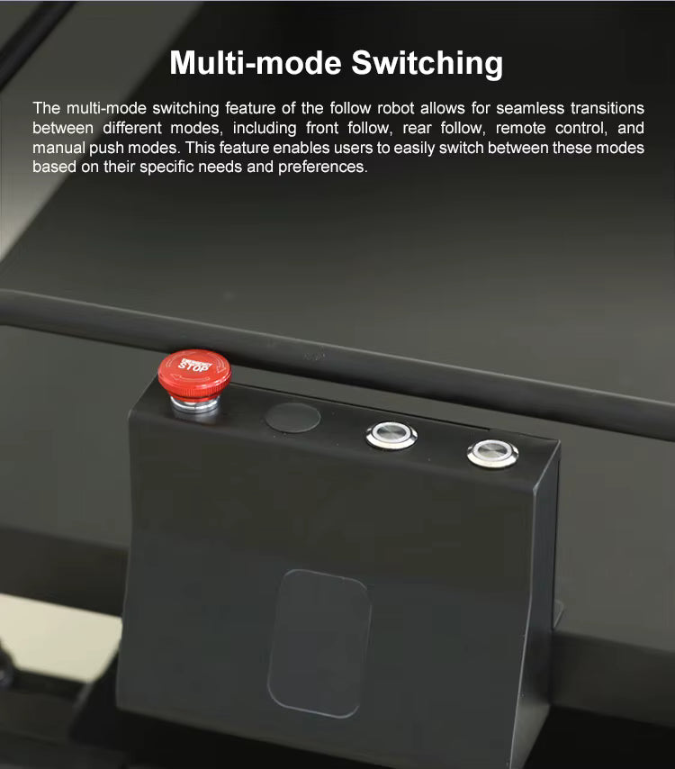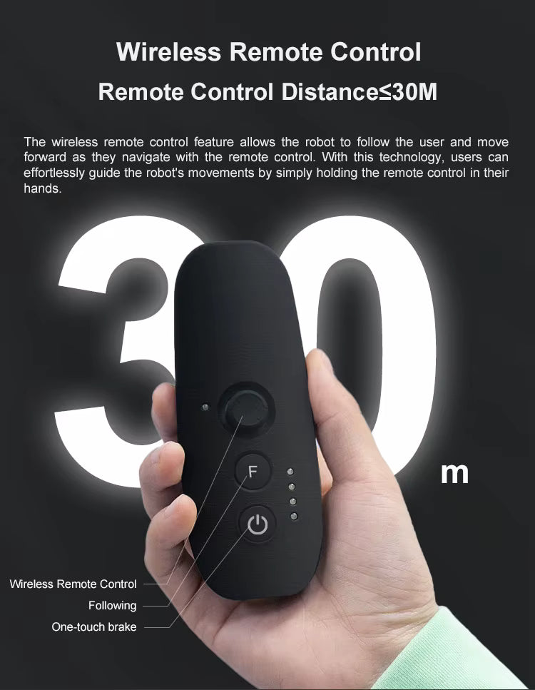 Le FOLO‑100 transporte jusqu’à 100 kg avec aisance, grâce à ses quatre roues robustes et son système anti‑collision laser à 360°. Son suivi intelligent suit l’opérateur jusqu’à 7 m, tandis que la télécommande sans fil atteint 30 m. La vitesse réglable jusqu’à 5,4 km/h et la capacité de franchir des pentes de 15° assurent une mobilité fluide en entrepôt. La batterie 24 V 20 Ah se recharge en 4 h, garantissant des heures de service continu.