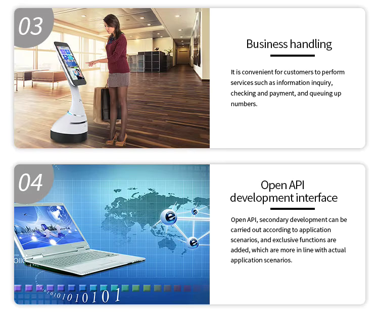 - Design interactif : Équipé d’un visage LED, il offre une expérience engageante et rassurante pour vos clients.